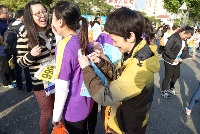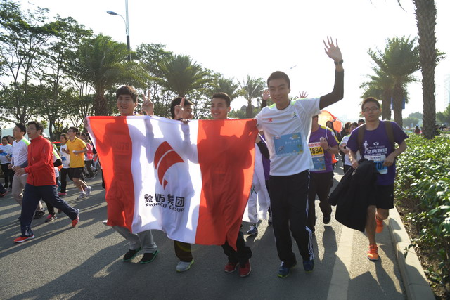 盡管冬日清晨有些凍人,但這絲毫沒有“凍”壞象嶼人的熱情。一進(jìn)入賽場(chǎng),大家就摩拳擦掌,躍躍欲試。今年的馬拉松對(duì)象嶼跑團(tuán)而言,有著特殊的意義,這不僅是一場(chǎng)健康跑,更是一場(chǎng)公益跑。此次比賽跑道恰好與火燒嶼隔海相望,由集團(tuán)捐資建立的中華白海豚救護(hù)繁育基地正坐落島上。白海豚的可愛形象也隨之出現(xiàn)在象嶼“跑男”“跑女”的前胸、后背。公益旗幟、白海豚公益宣傳貼紙,紅帆logo,以及我們朝氣蓬勃的象嶼跑團(tuán)組成了一道“有愛”的風(fēng)景線。這也吸引了周圍許多馬拉松參賽者的目光,有的參賽者甚至圍上前來詢問是否也能加入其中。于是,象嶼救助白海豚的公益之舉隨著象嶼人的奔跑也一路傳播開來。