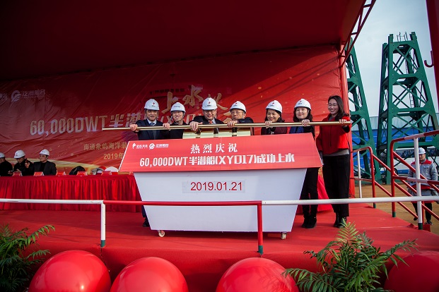 1月21日,由南通象嶼海洋裝備有限責(zé)任公司(以下簡稱“象嶼海裝”)建造的60,000DWT半潛船順利出塢。江蘇泛洲船務(wù)有限公司董事長江厥杰、中國科學(xué)院自動化研究所軍事顧問原海軍訓(xùn)練基地副司令員張錦榮、江蘇省交戰(zhàn)辦主任林有鎮(zhèn)、南京交通運輸局局長徐衛(wèi)國、中國船級社江蘇分社副總經(jīng)理張東標(biāo)、象嶼集團(tuán)黨委委員、象嶼股份黨委書記、總經(jīng)理、象嶼海裝董事長鄧啟東等共計200多名各界人士參加了象嶼海裝60,000DWT遠(yuǎn)洋自航半潛船上水儀式。