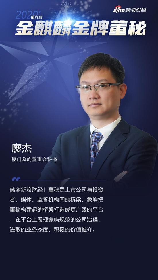 廈門(mén)象嶼董事會(huì)秘書(shū)廖杰獲評(píng)新浪財(cái)經(jīng)“2020年度金麒麟·金牌董秘”