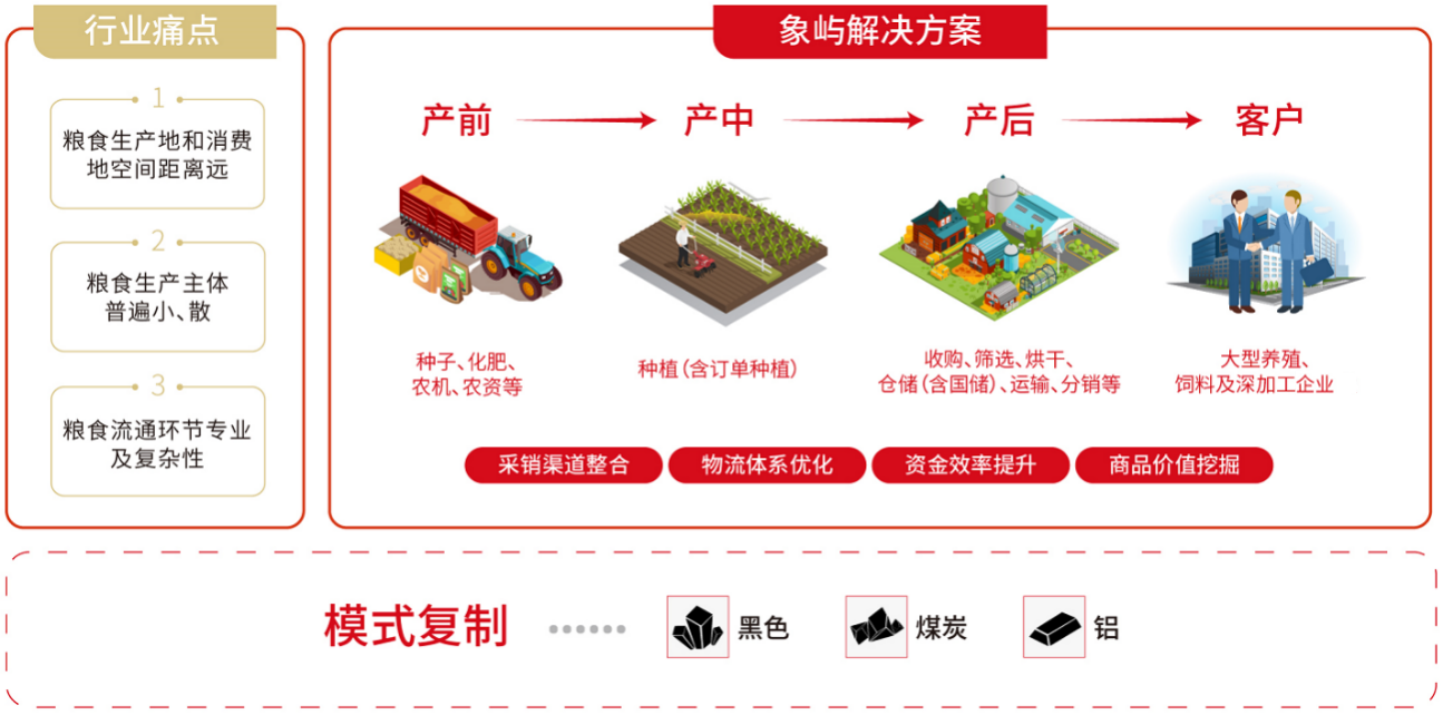 今年初,象嶼聯(lián)手阿里云結(jié)合東北農(nóng)業(yè)實際,攜手在糧食板塊先行先試建設(shè)農(nóng)業(yè)產(chǎn)業(yè)級互聯(lián)網(wǎng)平臺。該平臺將貫穿糧食產(chǎn)業(yè)鏈種植、倉儲、流通三大環(huán)節(jié),借助物聯(lián)網(wǎng)、云計算、區(qū)塊鏈?zhǔn)侄螌崿F(xiàn)輕資產(chǎn)模式下倉容快速擴張,連接用糧方、金融、物流等生態(tài)方,提升全產(chǎn)業(yè)鏈貿(mào)易、物流與金融效率。 未來,象嶼農(nóng)產(chǎn)將做深“一條鏈”,做大“一個園”,形成共創(chuàng)共享共贏的全產(chǎn)業(yè)鏈資源生態(tài)系統(tǒng),圍繞“雙循環(huán)”發(fā)展格局,進一步優(yōu)化投資結(jié)構(gòu),延伸投資鏈條,創(chuàng)新產(chǎn)業(yè)模式,為鄉(xiāng)村振興、促進農(nóng)業(yè)高質(zhì)高效發(fā)展貢獻力量!