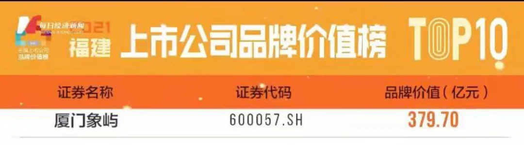 近日,由每日經(jīng)濟(jì)新聞主辦的“2021中國上市公司品牌價值藍(lán)皮書發(fā)布暨中國資本市場年度榮譽(yù)盛典”成功舉辦。廈門象嶼繼此前入圍“2021中國上市公司品牌價值活力榜TOP 100”后,再次入圍“2021福建上市公司品牌價值榜TOP 10”,品牌價值高達(dá)379.70億元,同時公司董事會秘書廖杰榮獲“2021最佳主板上市公司董秘”。