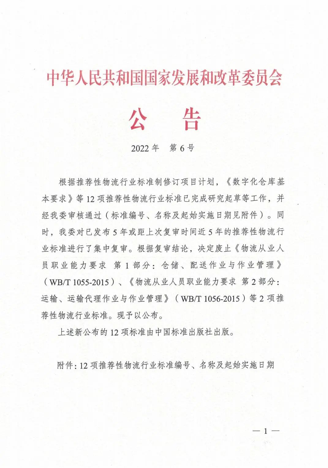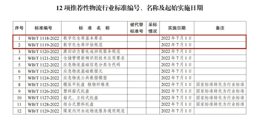 近日,中華人民共和國國家發(fā)展和改革委員會印發(fā)了2022年第6號公告,批準發(fā)布12項推薦性物流行業(yè)標準。其中,由廈門象嶼股份有限公司參與編寫的《數字化倉庫基本要求》(WB/T 1118-2022)《數字化倉庫評估規(guī)范》(WB/T 1119-2022)2項推薦性物流行業(yè)標準于2022年7月1日正式實施。