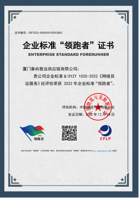 近日,“企業(yè)標(biāo)準(zhǔn)領(lǐng)跑者管理信息平臺(tái)”正式發(fā)布“物流服務(wù)”領(lǐng)域首批企業(yè)標(biāo)準(zhǔn)“領(lǐng)跑者”企業(yè)名單。象嶼股份旗下廈門(mén)象嶼智運(yùn)供應(yīng)鏈有限公司憑借高水平的網(wǎng)絡(luò)貨運(yùn)服務(wù)質(zhì)量,良好的服務(wù)信譽(yù)以及扎實(shí)的企業(yè)管理體系,榮膺首批網(wǎng)絡(luò)貨運(yùn)服務(wù)“領(lǐng)跑者”。